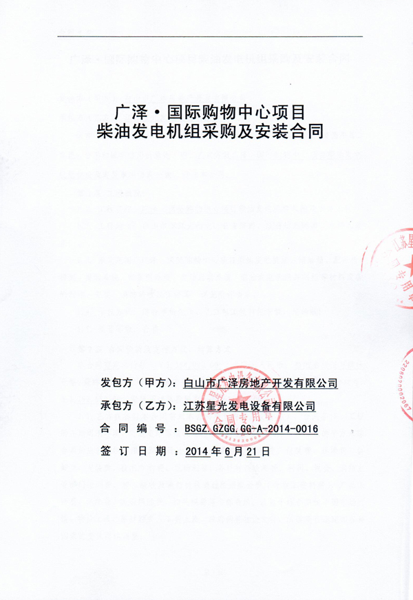 廣澤國際購物中心項(xiàng)目柴油發(fā)動機(jī)組采購及安裝合同